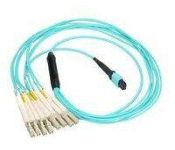 The cable comes with an MPO (Multiple-Fiber Push-On/Pull-off) connector on one end and four LC (Lucent Connector) connectors on the other end.